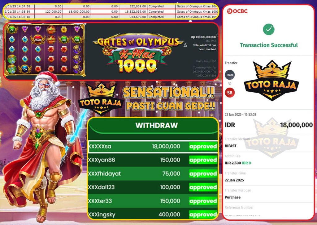 Selamat kepada bosku yang bermain di TOTORAJA dengan user id XXXXXsa yang telah mendapatkan kemenangan besar di game GATES OF OLYMPUS XMAS 1000!! > PRAGMATIC PLAY SLOT
