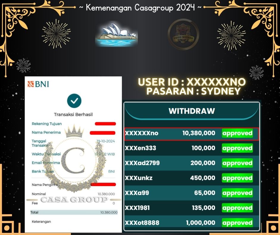 Total kemenangan di SYDNEY mencapai 10.380.000 Juta yang di menangkan oleh USER ID : XXXXXXNO disitus TOTOWAYANG Untuk kemenangan sudah mendarat ke tujuan tanpa ada potongan.