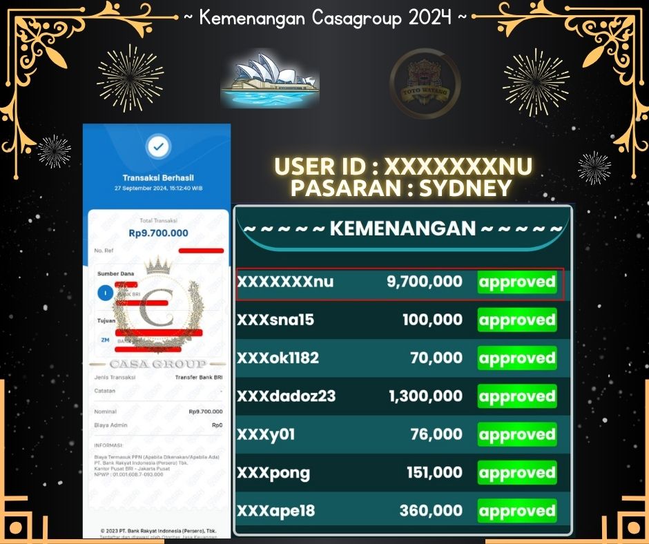 Total kemenangan di SYDNEY mencapai 9,700,000 juta yang di menangkan oleh USER ID : XXXXXXXNU disitus TOTOWAYANG