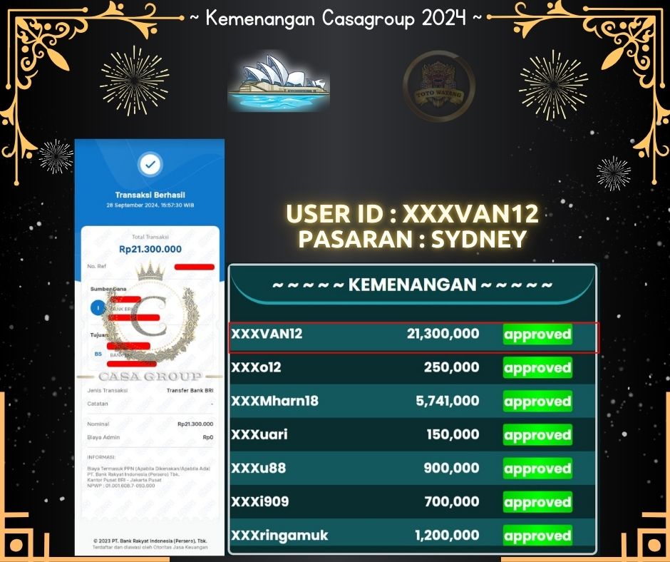 Total kemenangan di SYDNEY mencapai 21,300,000 Juta yang di menangkan oleh USER ID : XXXVAB12 disitus TOTOWAYANG
