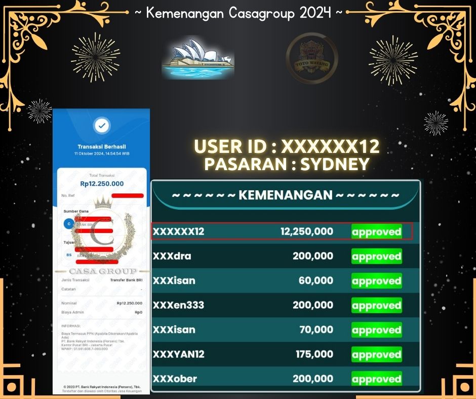 Total kemenangan di SYDNEY mencapai 12.250.000 Juta yang di menangkan oleh USER ID : XXXXXX12 disitus TOTOWAYANG Untuk kemenangan sudah mendarat ke tujuan tanpa ada potongan.