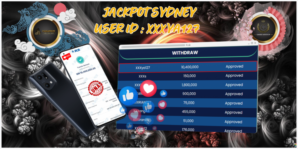 Selamat atas jackpot paus untuk member CASAPRIZE dengan user id : xxxya127 yang telah berhasil menang pada pasaran SYDNEY sebesar Rp. 10.400.000 ,-