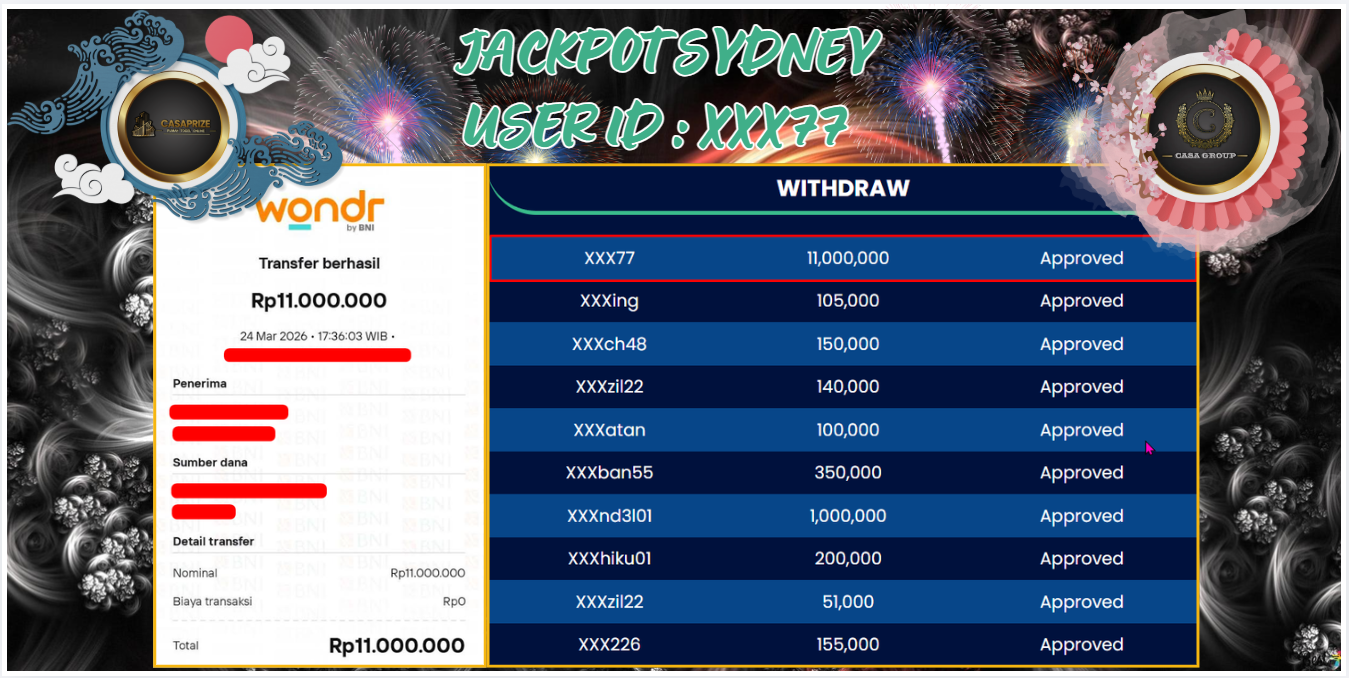 Selamat atas jackpot paus untuk member CASAPRIZE dengan user id : xxx77 yang telah berhasil menang pada pasaran SYDNEY sebesar Rp. 11.000.000 ,-