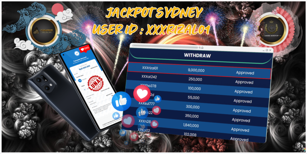 Selamat atas jackpot paus untuk member CASAPRIZE dengan user id : xxxrizal01 yang telah berhasil menang pada pasaran SYDNEY sebesar Rp. 9.000.000 ,-