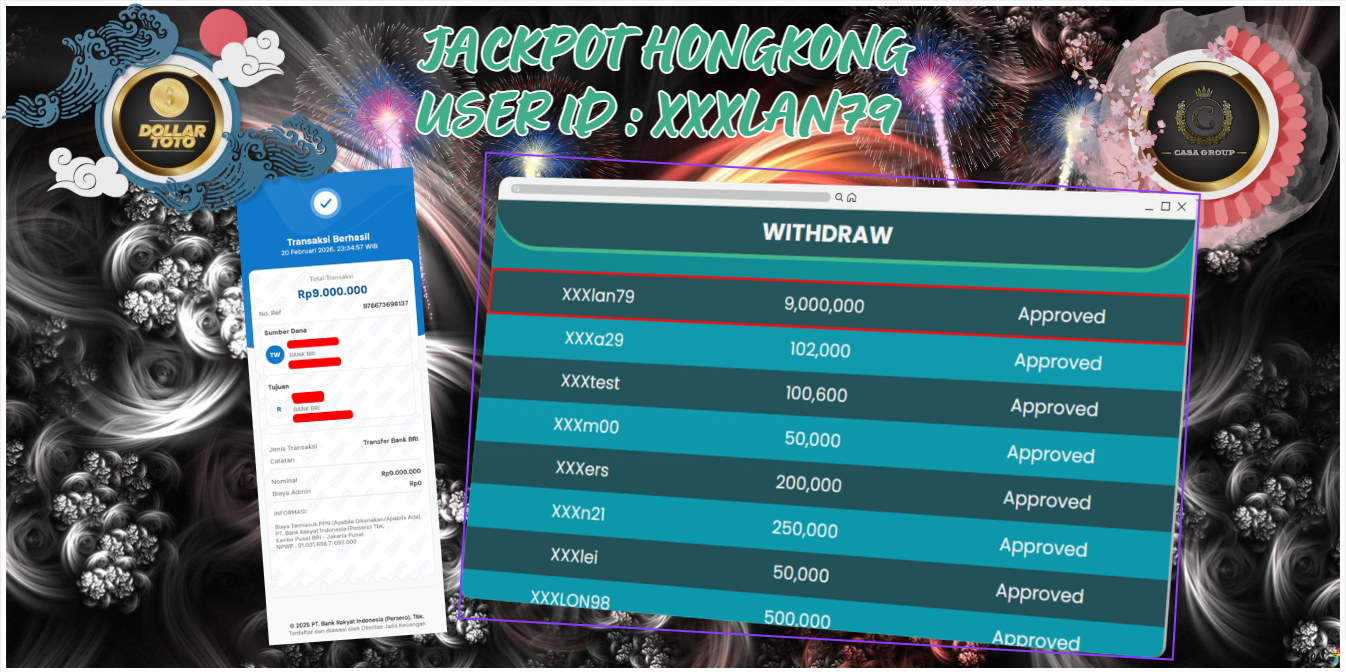 Selamat atas jackpot paus untuk member DOLLARTOTO dengan user id : xxxlan79 yang telah berhasil menang pada pasaran HONGKONG sebesar Rp. 9.000.000 ,-
