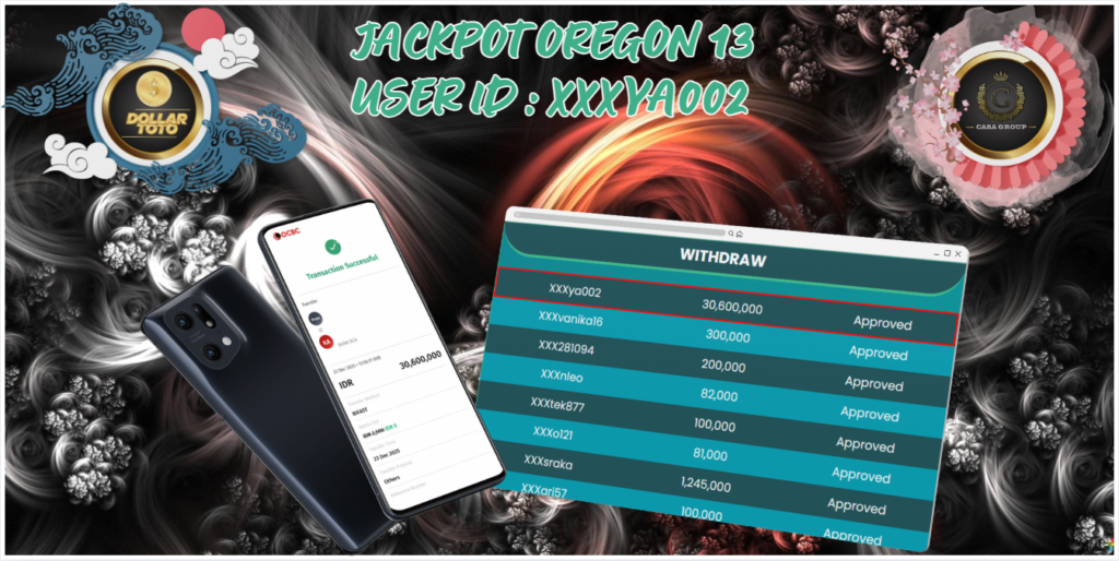 Selamat atas jackpot paus untuk member DOLLARTOTO dengan user id : xxxya002 yang telah berhasil menang pada pasaran OREGON 13 sebesar Rp. 30.600.000 ,-