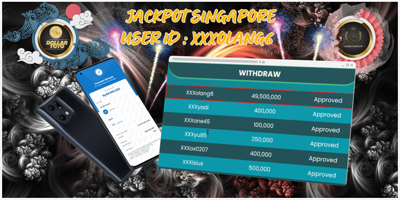 Selamat atas jackpot paus untuk member DOLLARTOTO dengan user id : xxxolang6 yang telah berhasil menang pada pasaran SINGAPORE sebesar Rp. 49.500.000 ,-