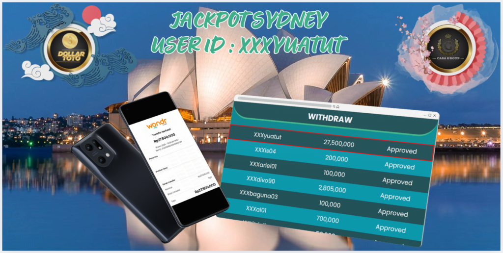 Selamat atas jackpot paus untuk member DOLLARTOTO dengan user id : xxxyuatut yang telah berhasil menang pada pasaran SYDNEY sebesar Rp. 27.500.000 ,-
