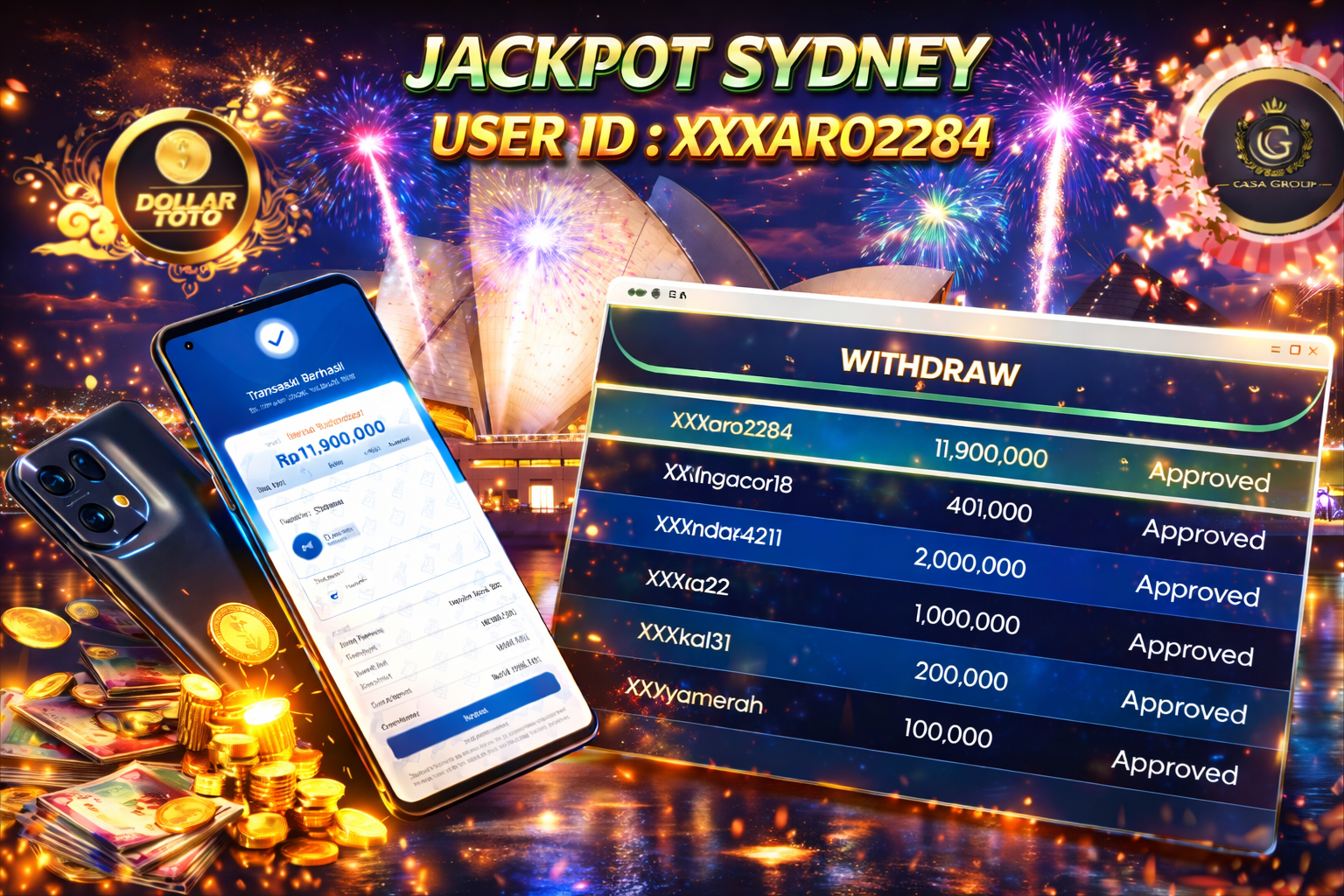 Selamat atas jackpot paus untuk member DOLLARTOTO dengan user id : xxxaro2284 yang telah berhasil menang pada pasaran SYDNEY sebesar Rp. 11.900.000 ,-