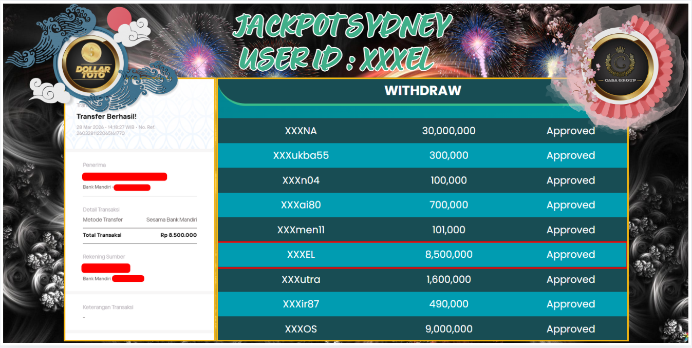 Selamat atas jackpot paus untuk member DOLLARTOTO dengan user id : xxxEL yang telah berhasil menang pada pasaran SYDNEY sebesar Rp. 8.500.000 ,-
