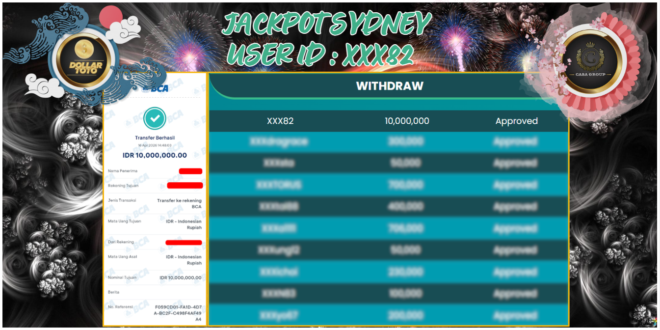 Selamat atas jackpot paus untuk member DOLLARTOTO dengan user id : xxx82 yang telah berhasil menang pada pasaran SYDNEY sebesar Rp. 10.000.000 ,-