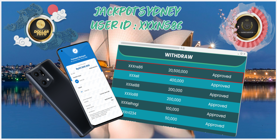 Selamat atas jackpot paus untuk member DOLLARTOTO dengan user id : xxxns86 yang telah berhasil menang pada pasaran SYDNEY sebesar Rp. 20.500.000 ,-