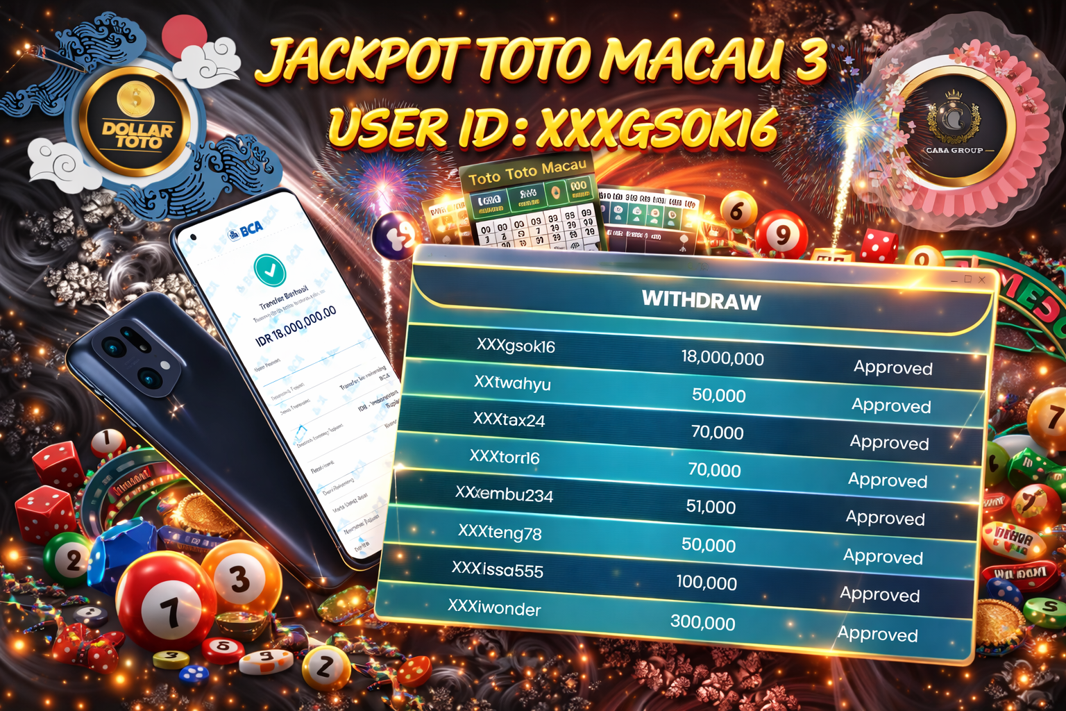 Selamat atas jackpot paus untuk member DOLLARTOTO dengan user id : xxxgsok16 yang telah berhasil menang pada pasaran TOTO MACAU 3 sebesar Rp. 18.000.000 ,-