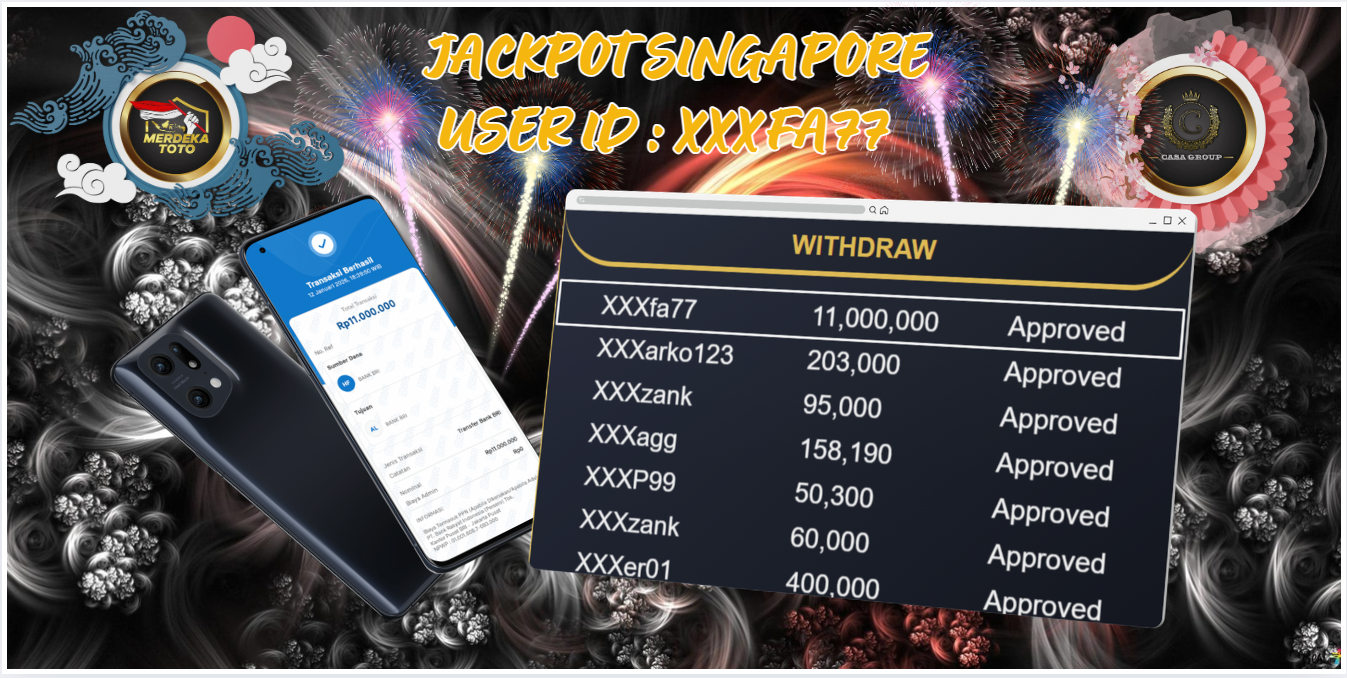 Selamat atas jackpot paus untuk member MERDEKATOTO dengan user id : xxxfa88 yang telah berhasil menang pada pasaran SINGAPORE sebesar Rp. 11.000.000 ,-