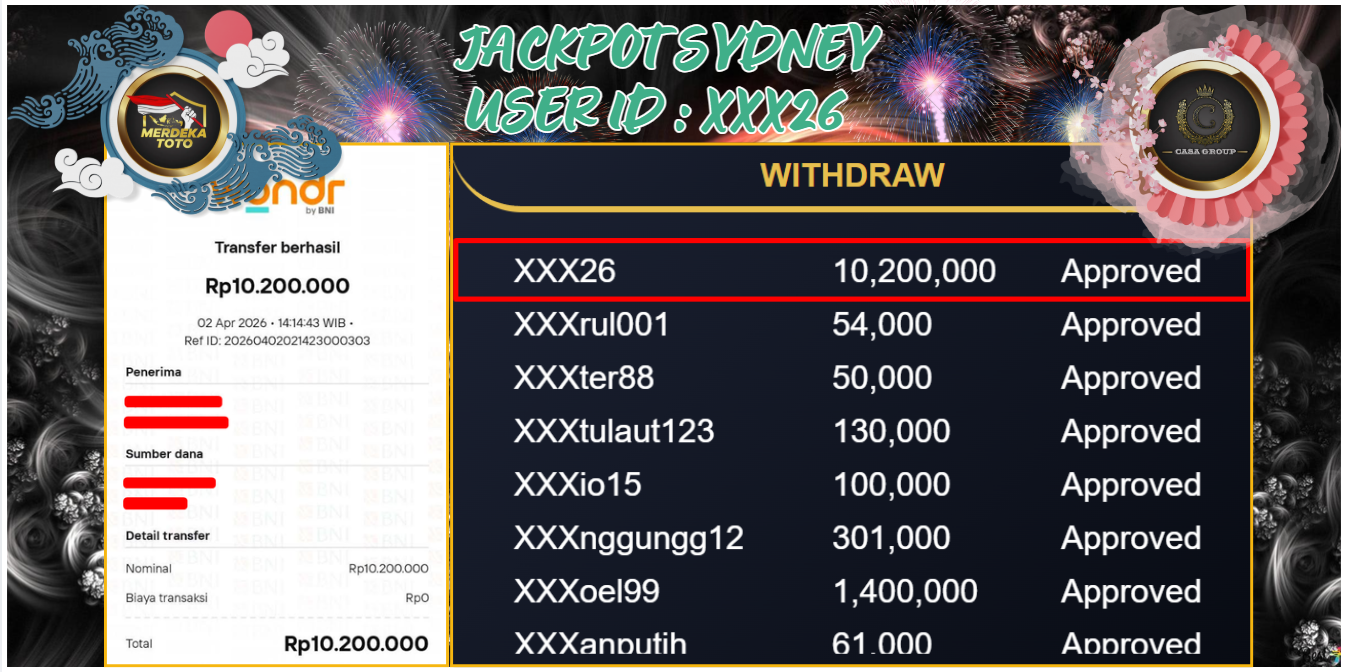 Selamat atas jackpot paus untuk member MERDEKATOTO dengan user id : xxx26 yang telah berhasil menang pada pasaran SYDNEY sebesar Rp. 10.200.000 ,-