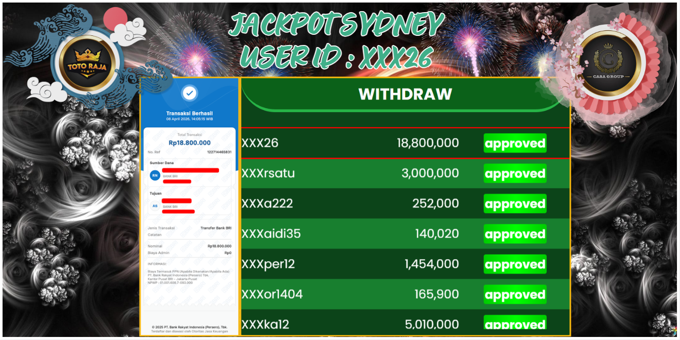 Selamat atas jackpot paus untuk member TOTORAJA dengan user id : xxx26 yang telah berhasil menang pada pasaran SYDNEY sebesar Rp. 18.800.000 ,-