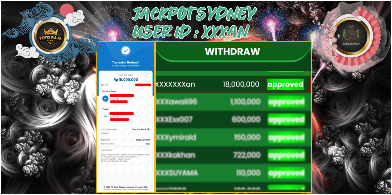 Selamat atas jackpot paus untuk member TOTORAJA dengan user id : xxxAN yang telah berhasil menang pada pasaran SYDNEY sebesar Rp. 18.000.000 ,-