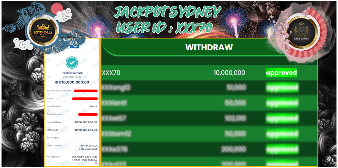 Selamat atas jackpot paus untuk member TOTORAJA dengan user id : xxx70 yang telah berhasil menang pada pasaran SYDNEY sebesar Rp. 10.000.000 ,-
