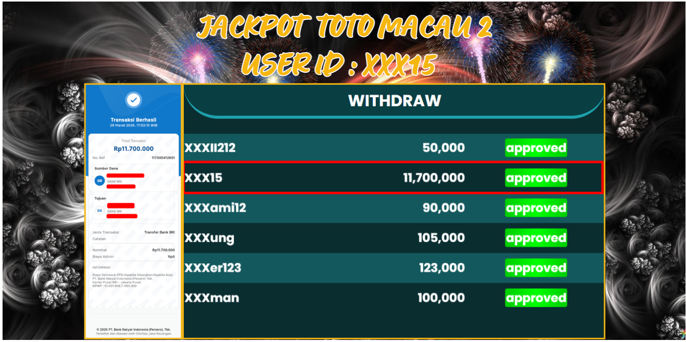 Selamat atas jackpot paus untuk member TOTOWAYANG dengan user id : xxx15 yang telah berhasil menang pada pasaran TOTO MACAU 2 sebesar Rp. 11.700.000 ,-