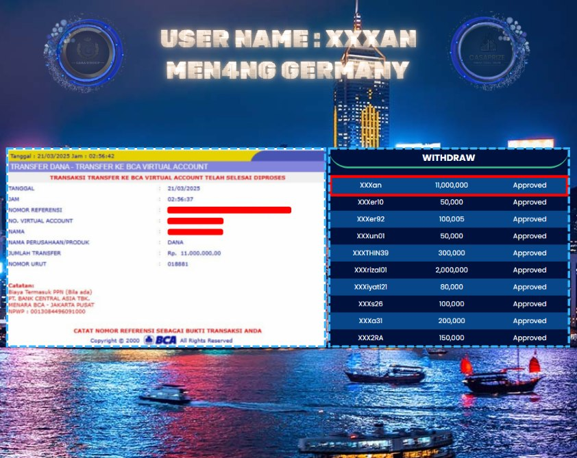 Selamat atas jackpot paus untuk member CASAPRIZE dengan user id : xxxAN yang telah berhasil menang pada pasaran GERMANY PLUS 5 sebesar Rp. 11.000.000 ,-