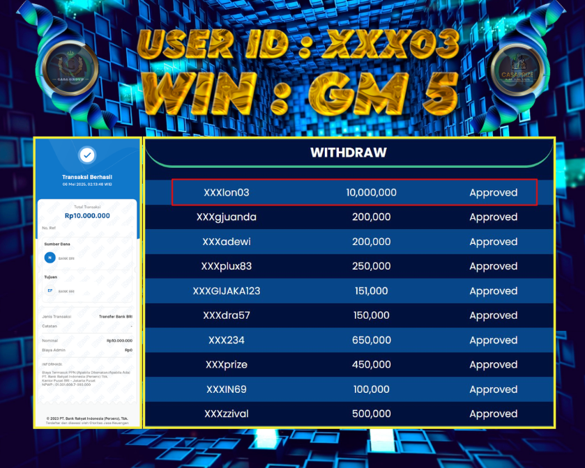 Selamat atas jackpot paus untuk member CASAPRIZE dengan user id : xxx03 yang telah berhasil menang pada pasaran GERMANY PLUS 5 sebesar Rp. 10.000.000 ,-