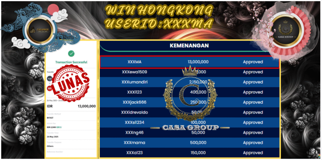 Selamat atas jackpot paus untuk member CASAPRIZE dengan user id : xxxma yang telah berhasil menang pada pasaran HONGKONG sebesar Rp. 13.000.000 ,-