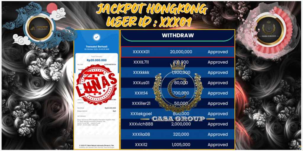 Selamat atas jackpot paus untuk member CASAPRIZE dengan user id : xxx01 yang telah berhasil menang pada pasaran HONGKONG sebesar Rp. 20.000.000 ,-