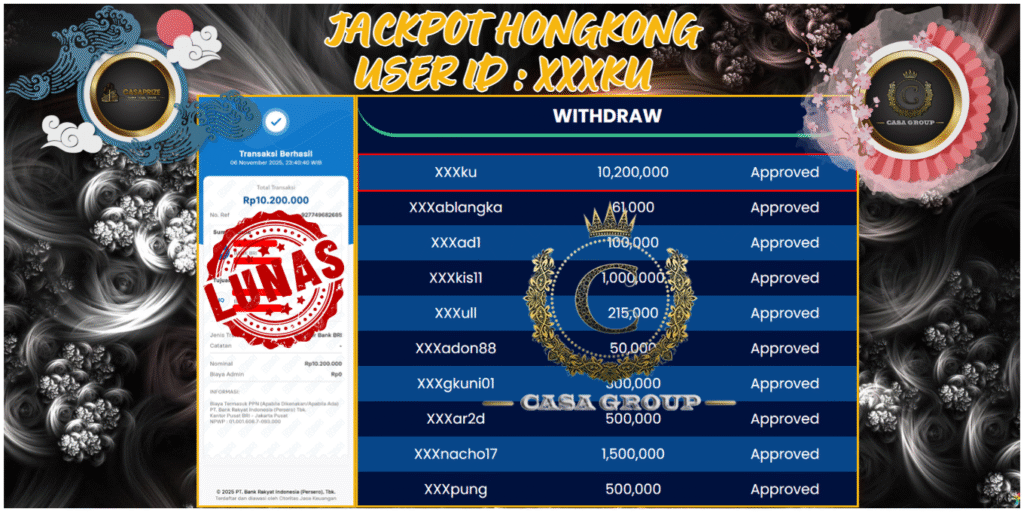 Selamat atas jackpot paus untuk member CASAPRIZE dengan user id : xxxku yang telah berhasil menang pada pasaran HONGKONG sebesar Rp. 10.200.000 ,-