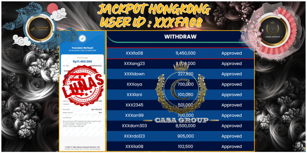 Selamat atas jackpot paus untuk member CASAPRIZE dengan user id : xxxfa08 yang telah berhasil menang pada pasaran HONGKONG sebesar Rp. 11.450.000 ,-