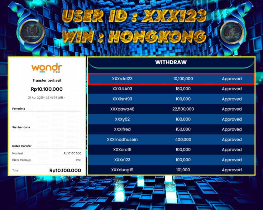 Selamat atas jackpot paus untuk member CASAPRIZE dengan user id : xxx123 yang telah berhasil menang pada pasaran HONGKONG sebesar Rp. 10.100.000 ,-