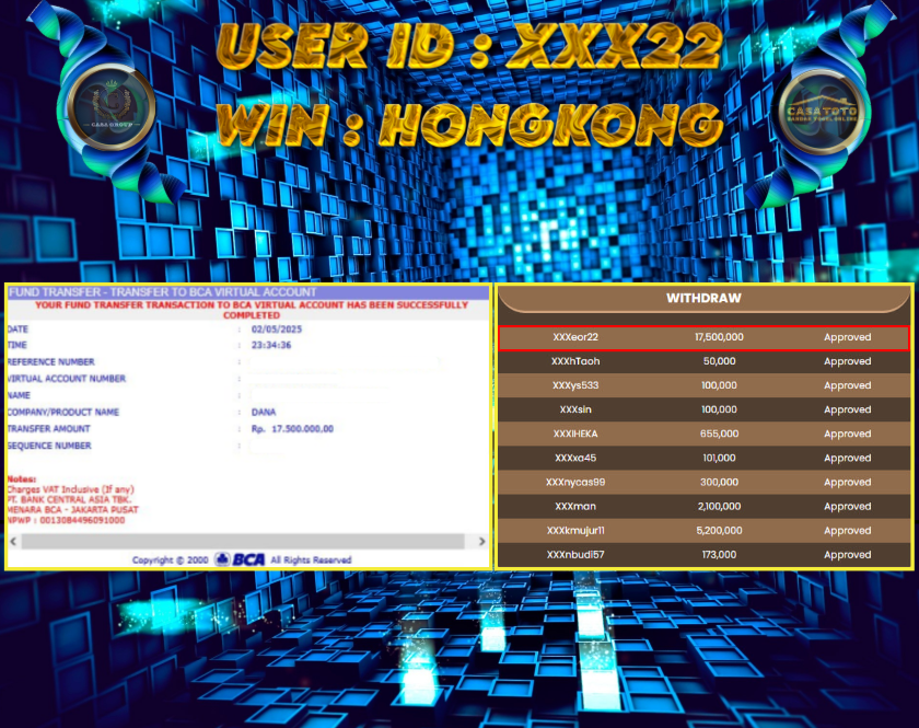 Selamat atas jackpot paus untuk member CASATOTO dengan user id : xxx22 yang telah berhasil menang pada pasaran HONGKONG sebesar Rp. 17.500.000 ,-