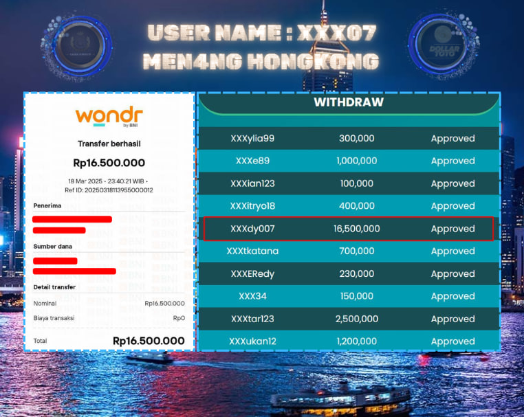 Selamat atas jackpot paus untuk member DOLLARTOTO dengan user id : xxx07 yang telah berhasil menang pada pasaran HONGKONG sebesar Rp. 16.500.000 ,-