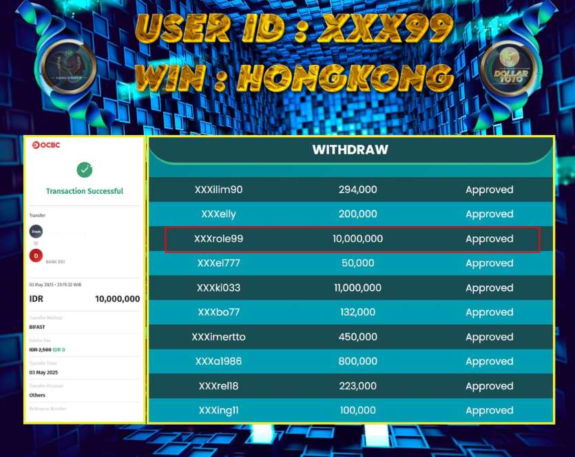 Selamat atas jackpot paus untuk member DOLLARTOTO dengan user id : xxx99 yang telah berhasil menang pada pasaran HONGKONG sebesar Rp. 10.000.000 ,-