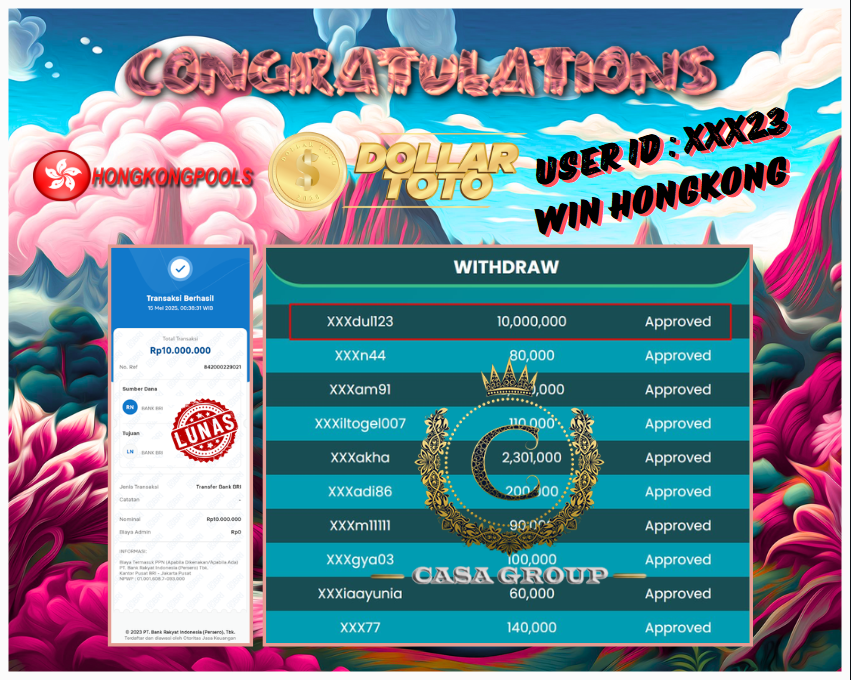 Selamat atas jackpot paus untuk member DOLLARTOTO dengan user id : xxx23 yang telah berhasil menang pada pasaran HONGKONG sebesar Rp. 10.000.000 ,-