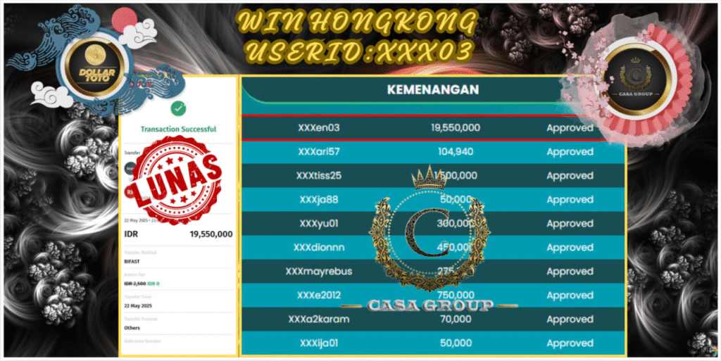 Selamat atas jackpot paus untuk member DOLLARTOTO dengan user id : xxx03 yang telah berhasil menang pada pasaran HONGKONG sebesar Rp. 19.550.000 ,-