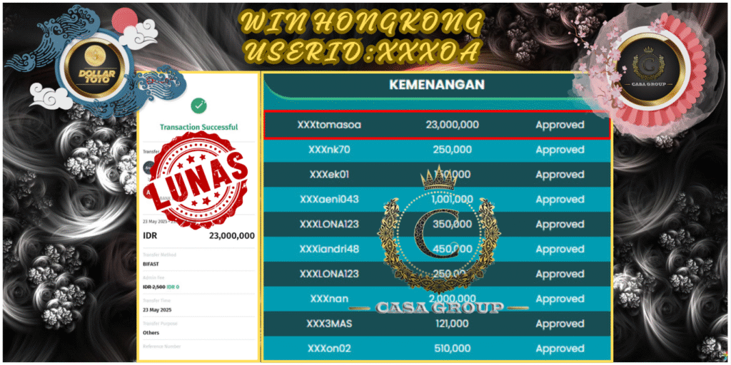 Selamat atas jackpot paus untuk member DOLLARTOTO dengan user id : xxxoa yang telah berhasil menang pada pasaran HONGKONG sebesar Rp. 23.000.000 ,-