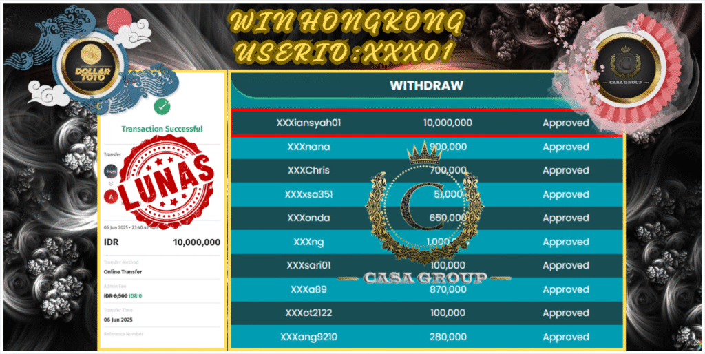 Selamat atas jackpot paus untuk member DOLLARTOTO dengan user id : xxx01 yang telah berhasil menang pada pasaran HONGKONG sebesar Rp. 10.000.000 ,-