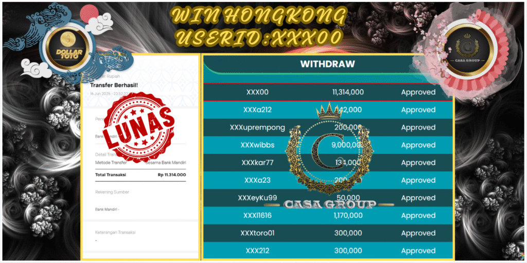 Selamat atas jackpot paus untuk member DOLLARTOTO dengan user id : xxx00 yang telah berhasil menang pada pasaran HONGKONG sebesar Rp. 11.314.000 ,-