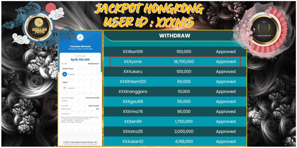 Selamat atas jackpot paus untuk member DOLLARTOTO dengan user id : xxxnis yang telah berhasil menang pada pasaran HONGKONG sebesar Rp. 18.700.000 ,-