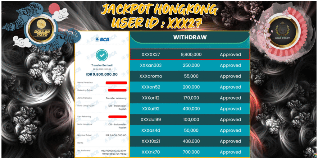 Selamat atas jackpot paus untuk member DOLLARTOTO dengan user id : xxx27 yang telah berhasil menang pada pasaran HONGKONG sebesar Rp. 9.800.000 ,-