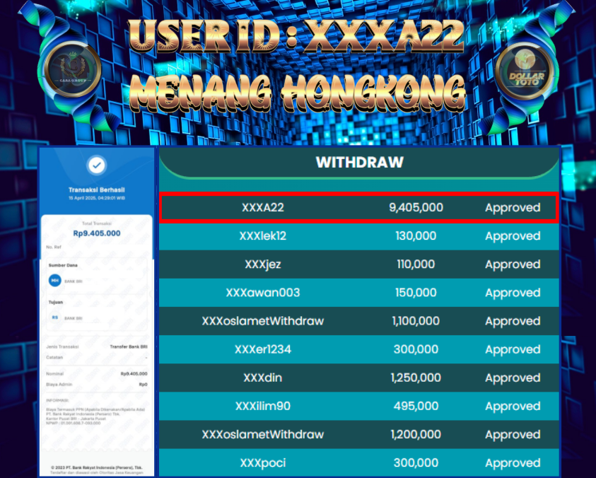 Selamat atas jackpot paus untuk member DOLLARTOTO dengan user id : xxxA22 yang telah berhasil menang pada pasaran HONGKONG sebesar Rp. 9.405.000 ,-