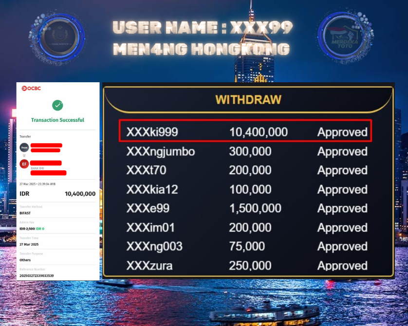 Selamat atas jackpot paus untuk member MERDEKATOTO dengan user id : xxx99 yang telah berhasil menang pada pasaran HONGKONG sebesar Rp. 10.400.000 ,-