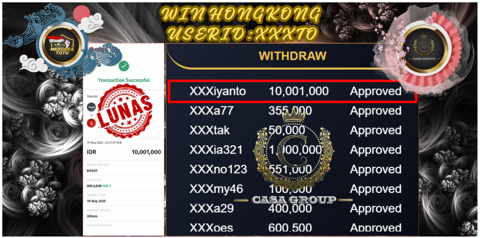 Selamat atas jackpot paus untuk member MERDEKATOTO dengan user id : xxxto yang telah berhasil menang pada pasaran HONGKONG sebesar Rp. 10.001.000 ,-