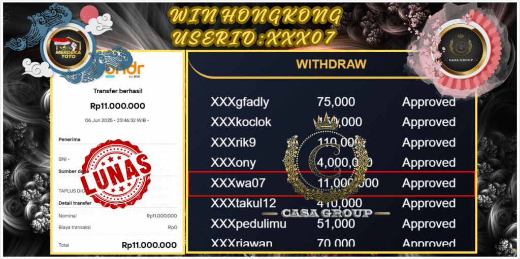 Selamat atas jackpot paus untuk member MERDEKATOTO dengan user id : xxx07 yang telah berhasil menang pada pasaran HONGKONG sebesar Rp. 11.000.000 ,-
