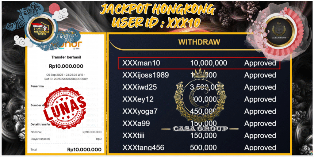 Selamat atas jackpot paus untuk member MERDEKATOTO dengan user id : xxx10 yang telah berhasil menang pada pasaran HONGKONG sebesar Rp. 10.000.000 ,-
