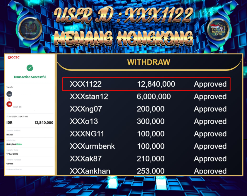 Selamat atas jackpot paus untuk member MERDEKATOTO dengan user id : xxx1122 yang telah berhasil menang pada pasaran HONGKONG sebesar Rp. 12.840.000 ,-