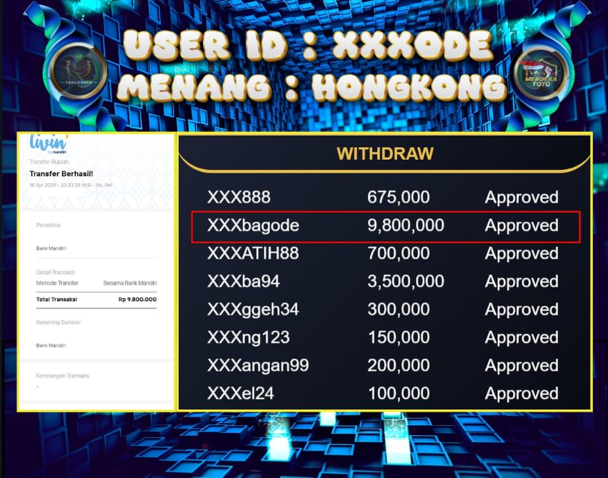 Selamat atas jackpot paus untuk member MERDEKATOTO dengan user id : xxxode yang telah berhasil menang pada pasaran HONGKONG sebesar Rp. 9.800.000 ,-