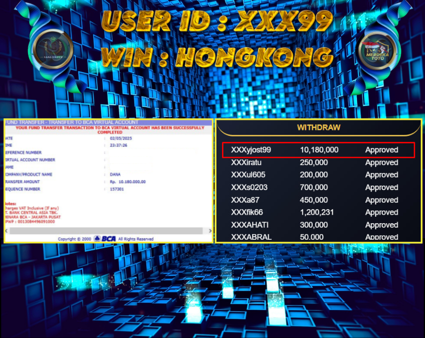 Selamat atas jackpot paus untuk member MERDEKATOTO dengan user id : xxx99 yang telah berhasil menang pada pasaran HONGKONG sebesar Rp. 10.180.000 ,-