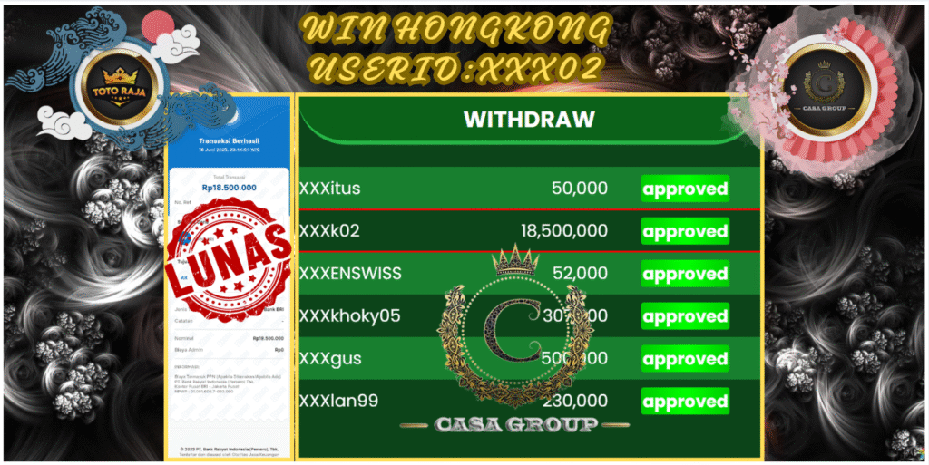 Selamat atas jackpot paus untuk member TOTORAJA dengan user id : xxx02 yang telah berhasil menang pada pasaran HONGKONG sebesar Rp. 18.500.000,-