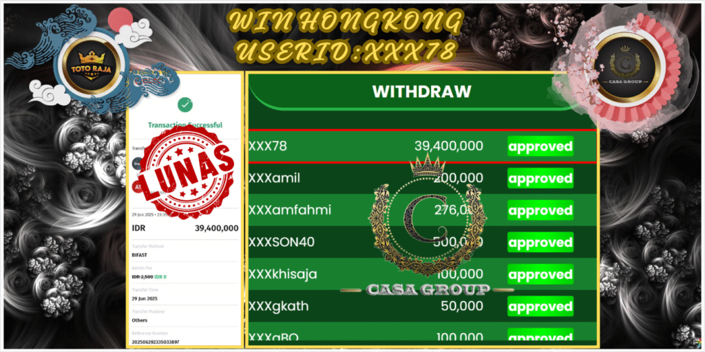 Selamat atas jackpot paus untuk member TOTORAJA dengan user id : xxx78 yang telah berhasil menang pada pasaran HONGKONG sebesar Rp. 39.400.000,-